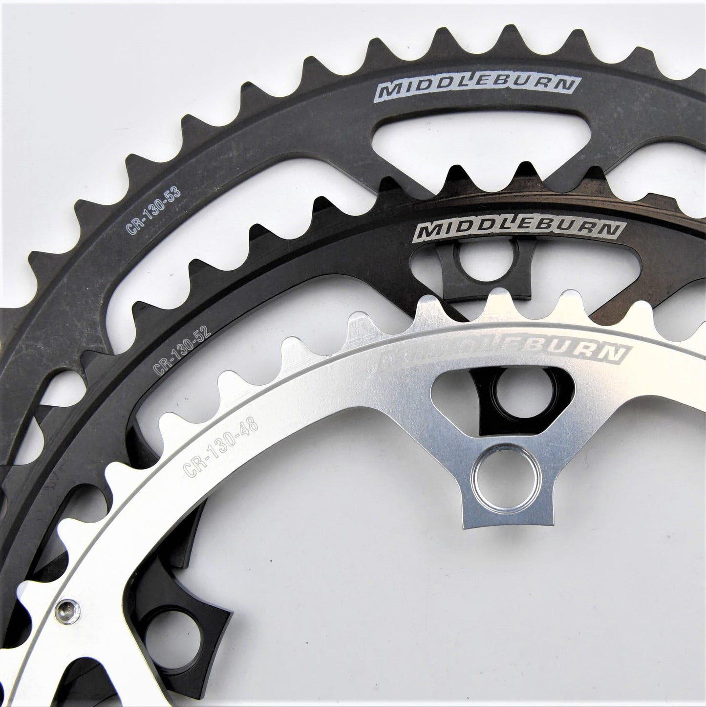 Middleburn 130BCD 5-Arm Outer Slickshift 9/10 Speed is available in sizes 48, 50, 52 and 53, with a colour choice of either black, silver or hard coat. These are for use in a triple chain ring configuration NOT a double.